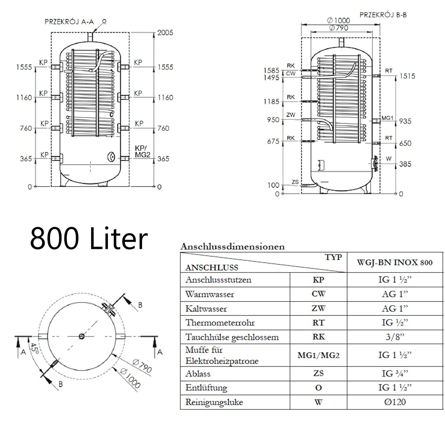 The WGJ-BN INOX combines a buffer tank for heating water with an integrated domestic hot water heater. Inside, a stainless steel corrugated pipe acts as a heat exchanger, providing a large contact surface for fast and efficient heat exchange and enabling instantaneous water heating. The maximum operating pressure of the tank is 0.3 MPa.