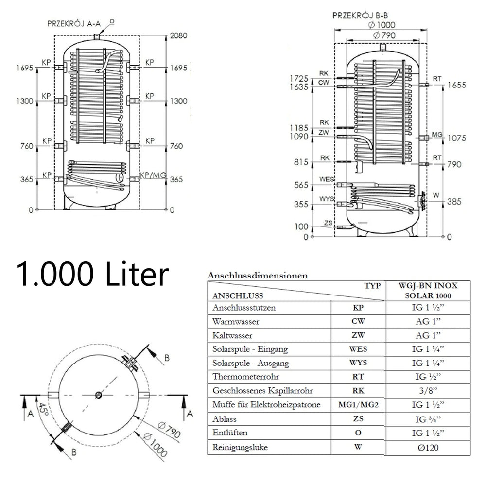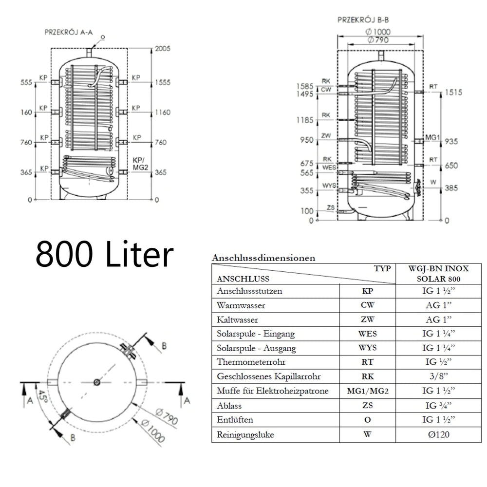 Der WGJ-BN INOX SOLAR ist ein kombinierter Pufferspeicher für Heizungswasser und Brauchwassererwärmer mit integrierter Edelstahl-Heizschlange als Wärmetauscher. Er wurde zur Einbindung in Zentralheizungsanlagen mit Heizkessel, Wärmepumpe oder zur Nutzung von Solarwärme konzipiert und ermöglicht sowohl die Speicherung von Heizenergie als auch die laufende Erwärmung von Trinkwasser.