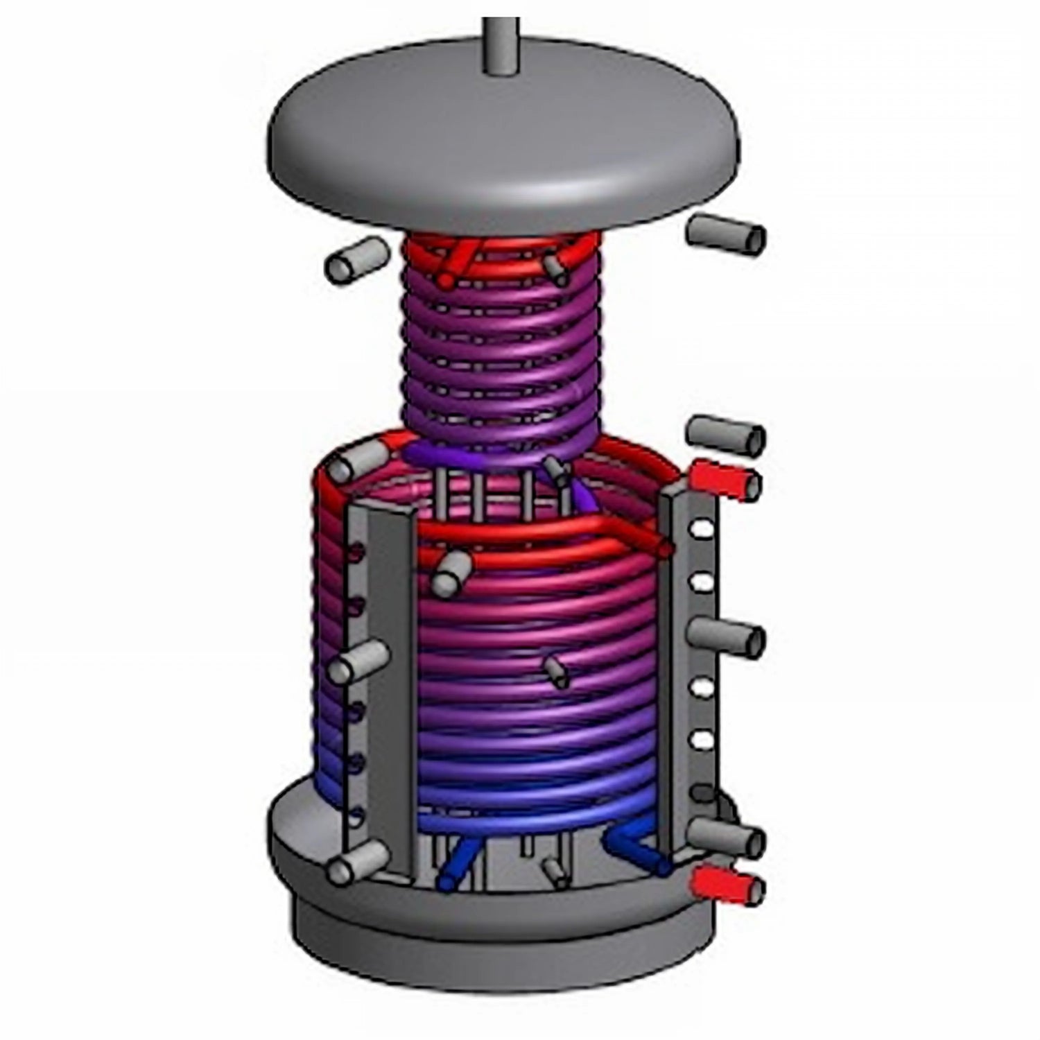 Vlnitá rúra z nehrdzavejúcej ocele slúži ako výmenník tepla pre sladkú vodu a vďaka svojej veľkej ploche ponúka vysoké hodnoty prietoku a výnosu. V nádrži je k dispozícii extra veľký výmenník tepla s hladkými rúrkami pre solárne a vykurovacie pripojenie, ktorý zabezpečuje efektívnu výmenu tepla medzi vykurovacím a pitným okruhom.