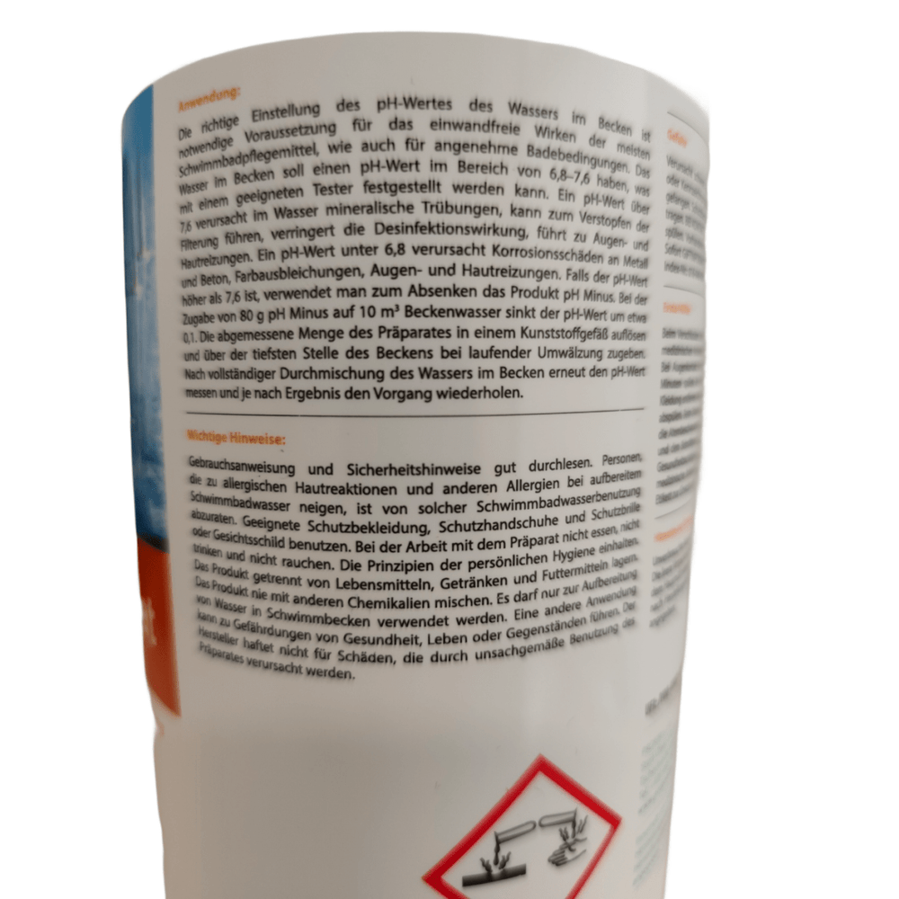 Det är viktigt att notera att pH Minus 1,5 kg endast är avsett för att justera surhetsgraden och inte är lämpligt för vattenrening. Dessutom kan hög vattenhårdhet försämra produktens effektivitet, så ytterligare åtgärder för att stabilisera hårdheten kan vara nödvändiga i hårt vatten.